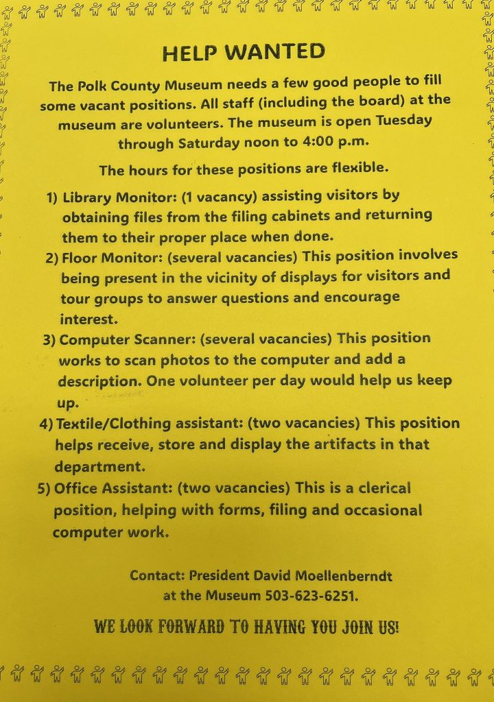 Call the Museum at (503)623-6251 to schedule a 2nd or 4th Saturday interview. Download the Volunteer Application Form through the link below, fill it out and bring it in with you or fill it out online and attach to an email to pchsoregon@gmail.com. This is a two page form that requires a signature on the second page.
